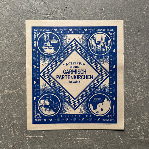 Das Siebdruckbild mit dem Schriftzug „Garmisch-Partenkirchen is always a good idea“ verbindet moderne Typografie mit der besonderen Atmosphäre der Alpen.